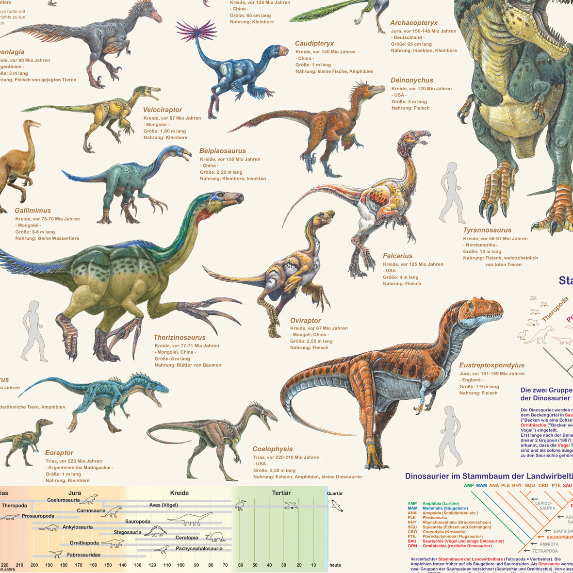 Ein besonderes Highlight des Posters ist die Darstellung der evolutionären Beziehung zwischen Dinosauriern und Vögeln. Es zeigt, wie aus den mächtigen Dinosauriern im Laufe der Evolution die Vögel hervorgingen, eine Erkenntnis, die sich erst in den letzten Jahrzehnten etabliert hat. Diese faszinierende Verbindung macht das Poster nicht nur zu einem visuellen Vergnügen, sondern auch zu einem informativen Werkzeug, das den aktuellen Stand der Wissenschaft wiedergibt.