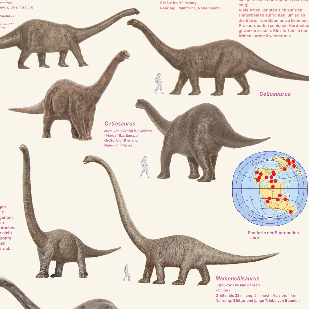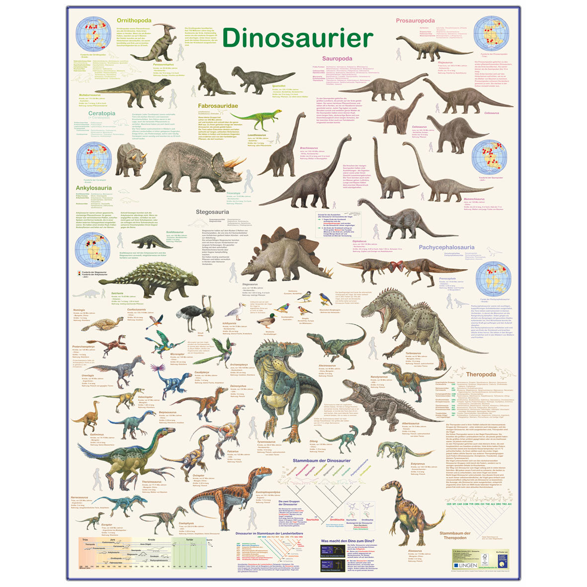 Auf unserem Poster werden die neun großen Gruppen der Dinosaurier lebensecht und in ihrer natürlichen Umgebung dargestellt. Jede Gruppe wird mit ausgewählten Artenbildern präsentiert, begleitet von Weltkarten, die die Kontinentalverschiebungen und die geografische Verbreitung der Dinosaurier zu ihrer Zeit zeigen. Zusätzlich sind die bekanntesten Gattungsnamen nach Untergruppen geordnet aufgeführt, was dieses Poster zu einem wahren Schatz für jeden Dinosaurier-Enthusiasten und Wissenschaftsliebhaber macht.