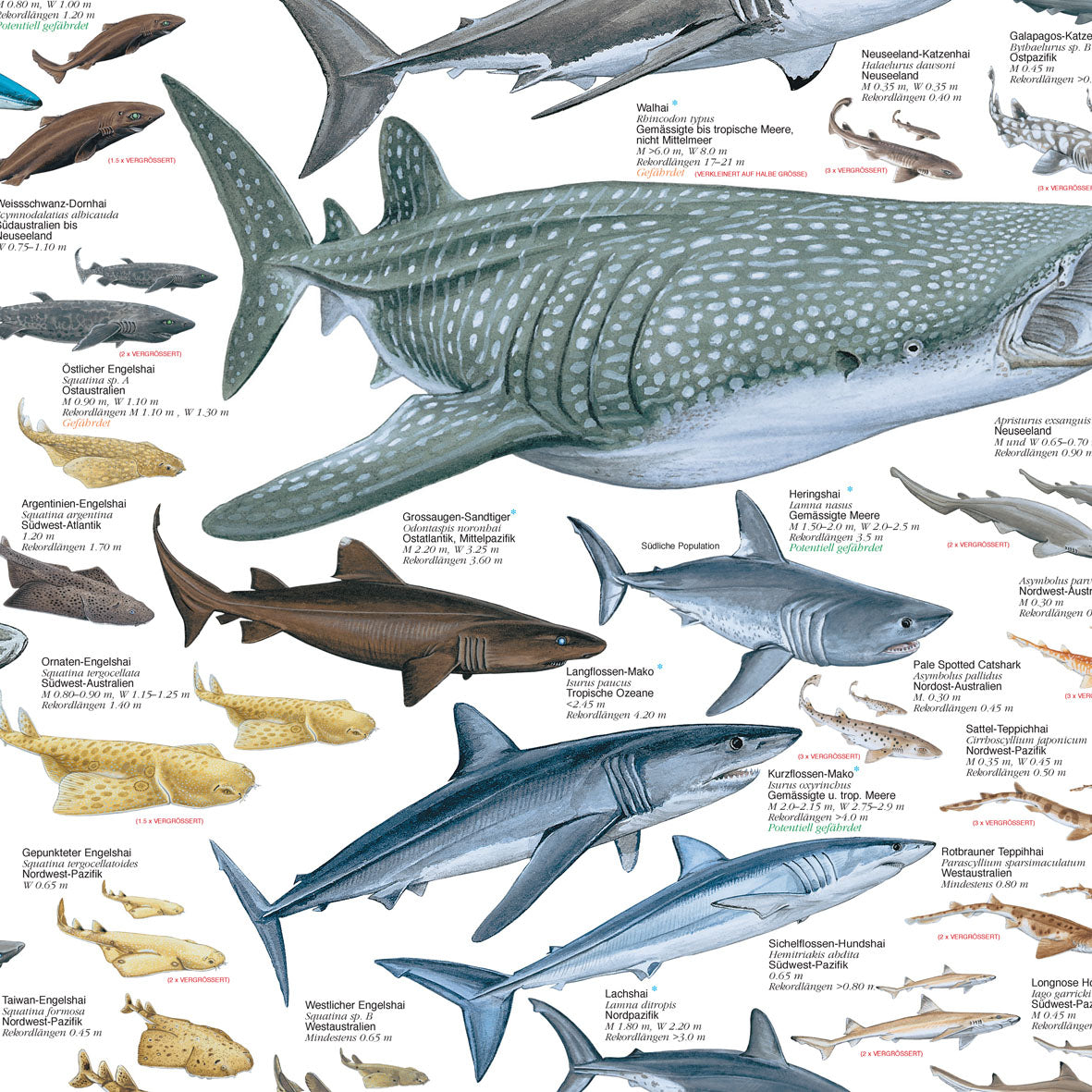 Durch die geschickte Anordnung der brillanten Zeichnungen entsteht eine eigene Dynamik im Poster, ähnlich wie in einem Fischschwarm. Das Poster stellt neben den bekannten Stars wie dem Weißen Hai, dem Riesenhai und dem Walhai auch die unbekannteren Arten vor. Tiefseehaie haben eine beeindruckende Formen- und Farbvielfalt entwickelt, allerdings fallen auch überraschende Ähnlichkeiten unter den Arten auf.