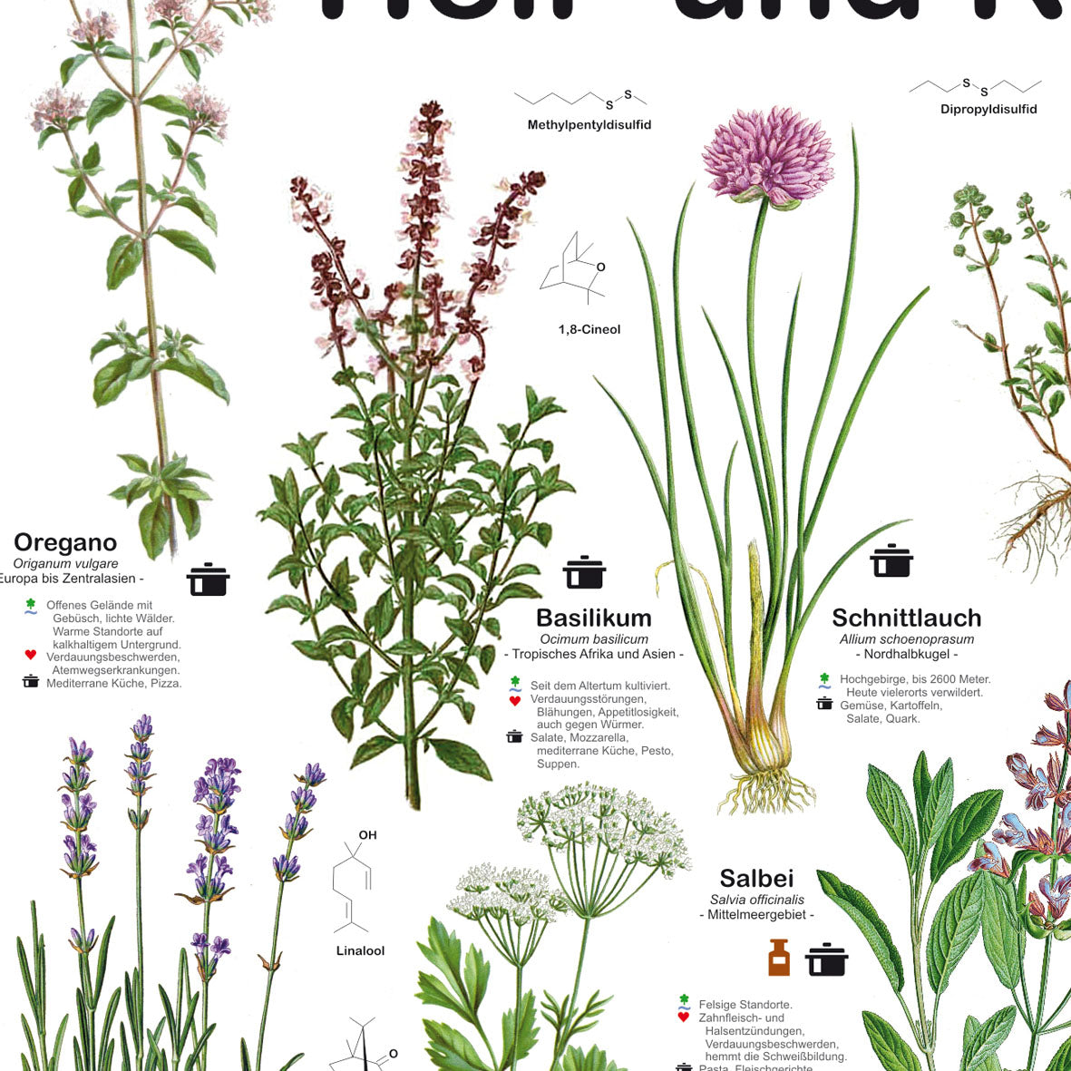 Dieses liebevoll gestaltete Poster präsentiert eine Auswahl der wichtigsten und beliebtesten Heil- und Küchenkräuter aus aller Welt. Zu jeder Pflanze finden Sie übersichtliche Informationen zur natürlichen Verbreitung, zur medizinischen Wirkung sowie zu ihrem kulinarischen Einsatz. So erfahren Sie zum Beispiel, dass Oregano nicht nur die mediterrane Küche bereichert, sondern traditionell auch bei Verdauungsbeschwerden und Atemwegserkrankungen genutzt wird.