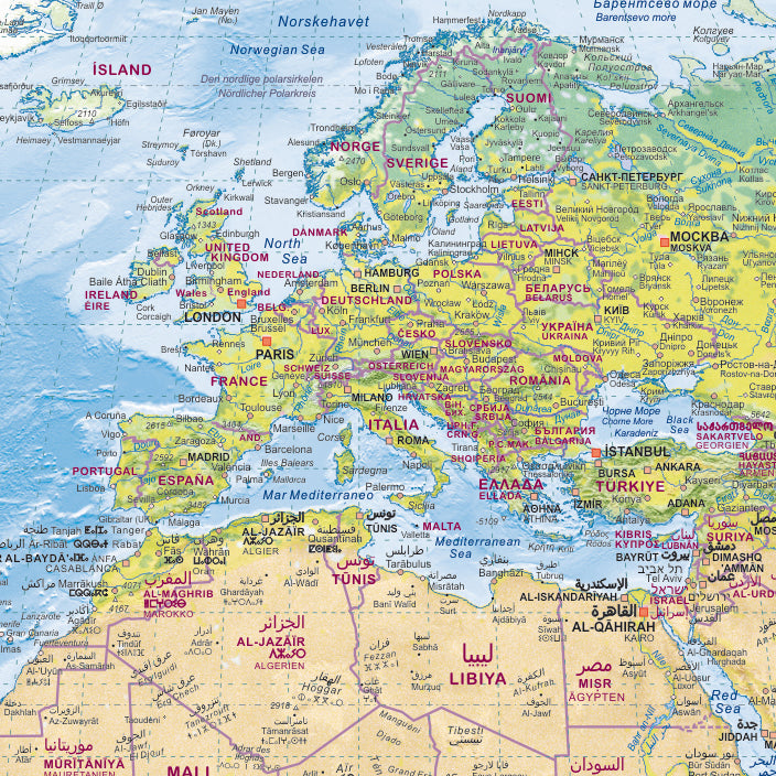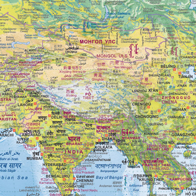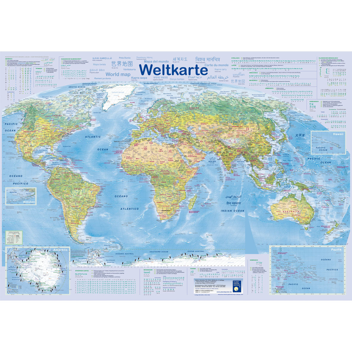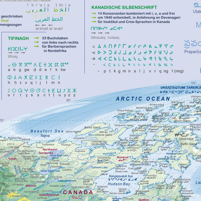 Ein besonderes Merkmal dieser Weltkarte ist, dass alle geografischen Bezeichnungen nicht nur in der internationalen Lingua Franca angegeben sind, sondern auch in der jeweiligen Landessprache und der dazugehörigen landestypischen Schrift. Diese sorgfältige und detailreiche Arbeit hat unsere Postermacher mehrere Jahre gekostet. Um Ihnen ein tiefergehendes Verständnis der verschiedenen Schriftsysteme zu ermöglichen, finden Sie Erklärungen und Alphabete zu den wichtigsten Schriften im Randbereich der Karte.